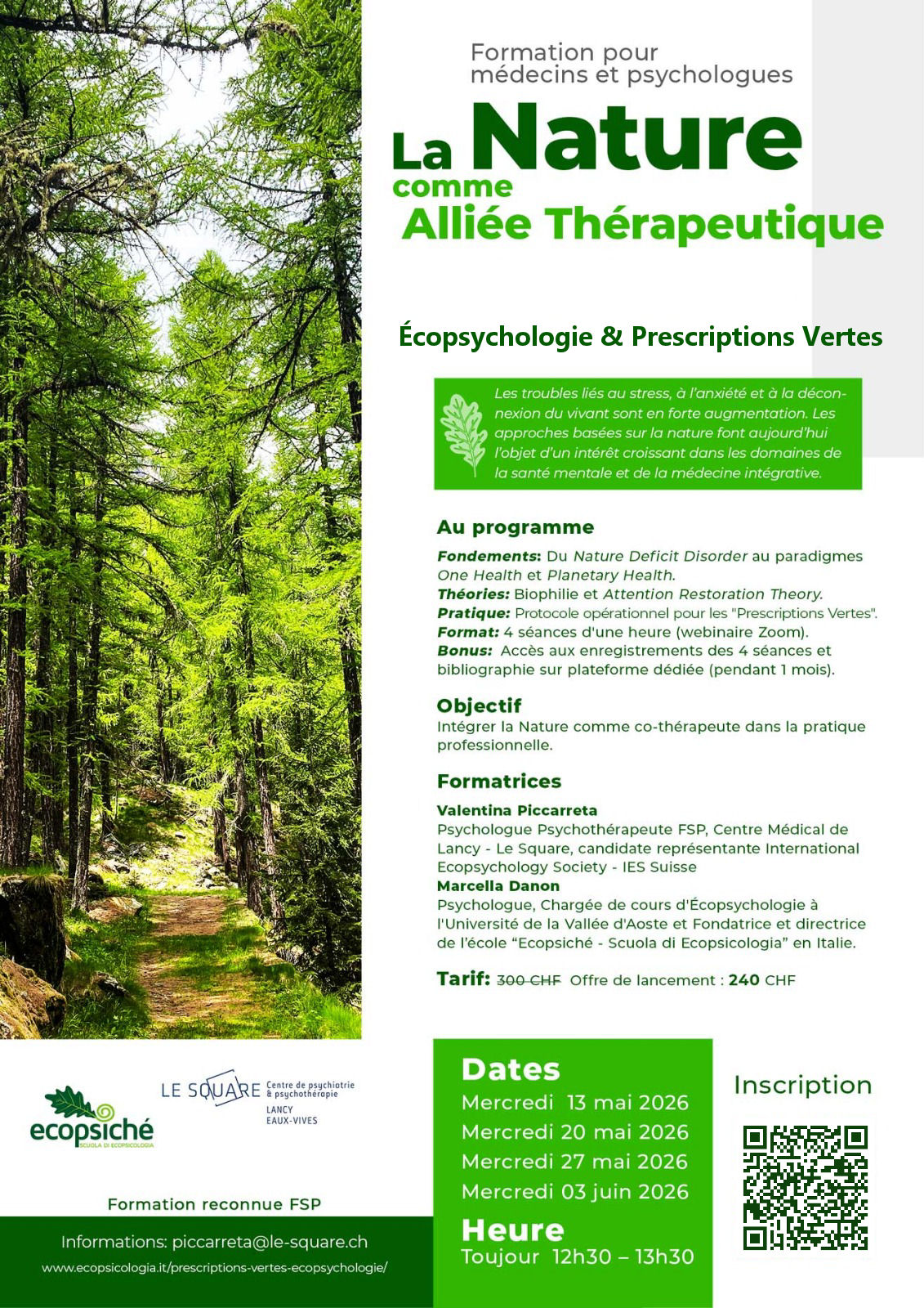 Psychologue Psychothérapeute FSP, Centre Médical de Lancy – Le Square. Candidate représentante International Ecopsychology Society – IES Suisse