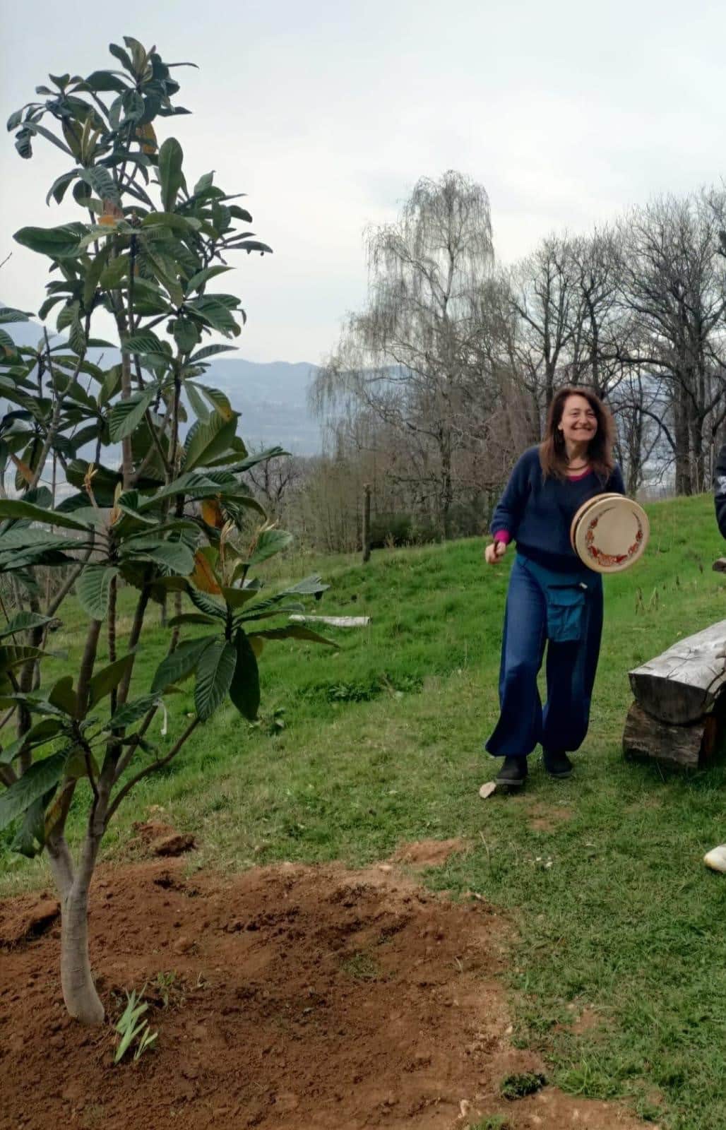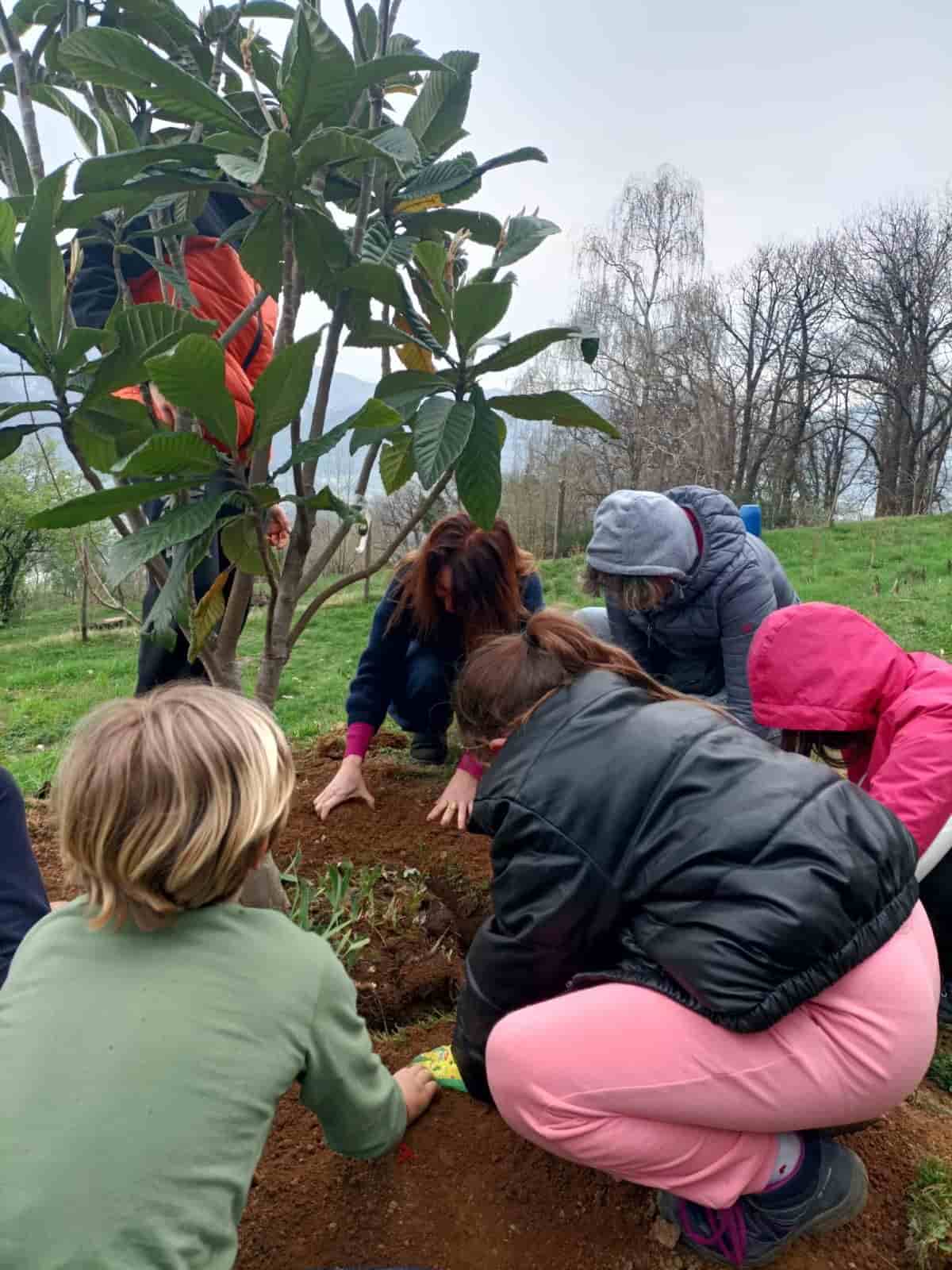 Infine, abbiamo piantumato un nespolo e due melograni davanti a Cascina Rapello, propiziando la crescita dei giovani alberi in modo speciale: rivolgendoci al cielo con le mani e il cuore abbiamo raccolto il prana (l’energia vitale che è presente ovunque e anche dentro di noi, secondo la tradizione spirituale indiana) e l’abbiamo diretto verso la terra, affondandovi le mani con rispetto e amore.